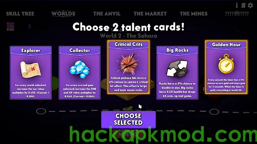 Make progress though the game via unlocking new worlds! Worlds can be purchased using your talent points. Talent point are gathered via leveling up. Every time you purchase a new world, 5 talent cards will appear. Choose 2 to keep!